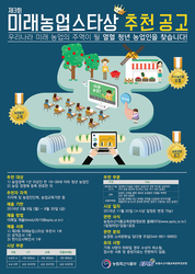 농림수산식품교육문화정보원(원장 박철수, 이하 농정원)이 우리 농업의 미래를 이끌어갈 청년 농업인들에게 주는 '미래농업스타상' 후보 추천을 받는다. 올해로 3회째를 맞는 '미래농업스타상'은 정보통신기술(ICT), 교육, 유통마케팅 등 세 개 분야에 대해 2명 씩 총 6명을 뽑는다. 수상자에게는 상금 150만원이 주어진다. 최근 통계청이 발표한 '2015 농림어업총조사 잠정 집계 결과'에 따르면 지난해 우리 농가 경영주의 평균 연령은 65.6세로, 5년 전에 비해 3.3세 높아졌다. 인구 비율로 보면 70대 이상이 37.8%, 60대 30.5%, 50대 22.7%로 50대 이상이 91%다. 농촌에서 50대 미만이 경영하는 농가는 10곳 중 1곳도 찾기 힘들다는 얘기다. 이에 농정원은 농촌에서 청춘을 불태우며 농업에 활기를 불어넣고 있는 청년 농업인들을 찾아서 격려하고, 농업이 청년들의 꿈을 실현하는 좋은 기회가 될 수 있음을 알리기 위해 2014년에 '미래농업스타상'을 제정했다. '미래농업스타상'은 농가 소득 증대 및 농업 발전을 위해 첨단기술 도입은 물론이고 유통과 마케팅, 교육을 적극적으로 활용하는 청년 농업인들을 시상한다. 구체적으로는 정보통신기술을 활용해