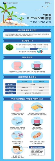 식품의약품안전처(처장 손문기)는 올해 해수에서 비브리오패혈증균(Vibrio vulnificus)이 예년보다 이르게 검출됨에 따라 질병관리본부 등 관계기관과 함께 오는 10월까지 여름철 수산물에 대한 안전관리를 강화한다고 밝혔다.비브리오패혈증균은 일반적으로 해수 온도가 18℃이상 상승하는 5~6월부터 나타나기 시작해서 10월께 소멸되는데 특히 7~9월에 비브리오패혈증 환자가 집중 발생되므로 수산물 관리에 각별한 주의가 요구된다. 질병관리본부 감염병 감시연보 2011년∼2014년 통계에 따르면 비브리오패혈증 환자 발생 235명, 사망자 137명으로 치명율은 58.3%에 다한다. 이번 수산물 안전관리 강화 조치는 비브리오패혈증균 검사를 생산단계, 유통·판매단계로 나뉘어 진행한다.생산단계에서는 해수, 갯벌 등 어패류 생산지 환경 조사와 해당 지역에서 생산된 어패류에 대한 안전성 조사를 실시한다. 어패류 생산지 환경에 대해서는 질병관리본부가 비브리오패혈증균 오염도를 조사하여 분포·실태 등의 정보를 관계기관에 제공한다. 생산지역에서 채취된 어패류 등의 비브리오패혈증균 조사는 국립수산과학원이 실시하고 수협중앙회 등 생산자조합도 자율적으로 안전성 조사에 참여한다.유통·판매
