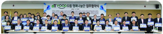 한국농수산식품유통공사(aT, 사장 김재수)는 농식품유통교육원 교육수료 기업 및 복지단체(노인·장애인·아동·다문화시설)와 연계하여 5월 11일 aT센터에서 사회공헌 프로그램인「aT FOOD드림 행복나눔단」을 발족하고 지속적으로 지역 상생에 이바지하기 위한 업무 협약식을 개최했다. 「aT FOOD드림 행복나눔단」은 농식품유통교육원의 교육생 기업 31개사와 지역 복지단체 10개소로 구성이 되었으며, 이번 상호 업무협약을 통해 참여기업의 생산품인 신선·가공 식품을 매월 지정된 복지단체에 기부하게 되고, 연말에 참여기업이 함께하는 봉사활동을 추진하기로 하였다. 이번 업무협약을 통해 복지단체에서 필요로 하는 물량과 종류를 사전에 면밀히 체크한 후, 참여기업에서 직접 생산·가공하는 각종 채소와 과일은 물론 가공식품 등 다양한 식재료를 정기적으로 배송함으로써 사회적 소외 계층의 실질적인 복지가 향상될 수 있도록 한 것이 aT FOOD드림 행복나눔단의 특징이라고 할 수 있다. aT는 향후 이번 프로그램을 전사적으로 확대해 올해 말까지 참여기업체 수 100개를 목표로 하는 대표적인 사회공헌 활동 프로그램으로 발전시키겠다는 계획이다. 김재수 aT 사장은 “‘aT FOOD드림 행